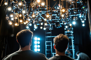 Technicians Testing Moving Lights and Rigging Systems on a Stage Before a Live Performance Begins