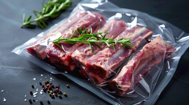 Raw lamb ribs on metal butcher's table ready for preparation