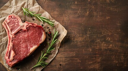Aged Beef T-Bone steak. Juicy cooked steak with rosemary and spices. Top view. Rustic style. Flat Lay.