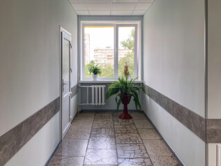 White, narrow hallway in Ukrainian hospital clinic with natural light, green plants, square tiles, white door, long perspective t