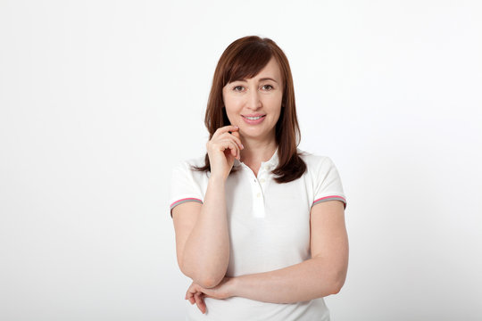 Thinking middle aged woman in white polo T-shirt isolated on white, copy space.