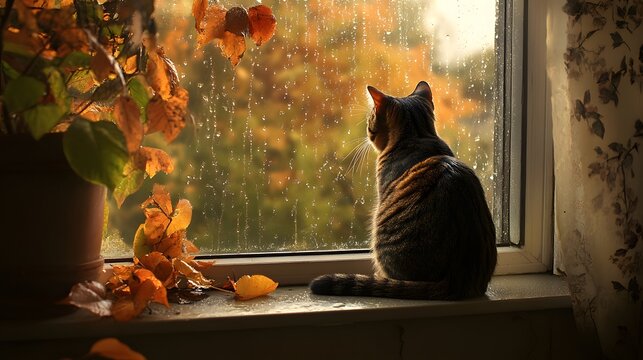 Long-haired tabby cat watching colorful wild birds through window in sunlit living room