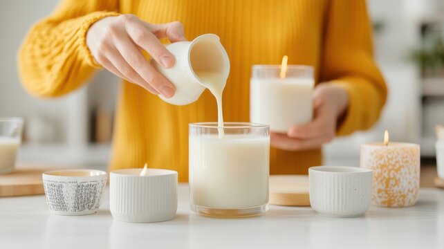 A person in a yellow sweater is pouring candle wax into a glass container surrounded by various candles on a table.