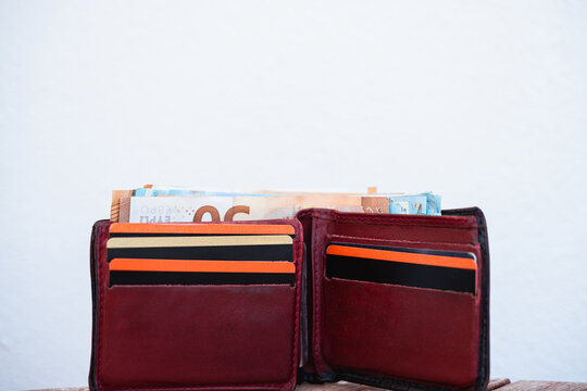 A brown leather men's wallet is open on a wooden table. In it are several credit cards and bills. Daylight