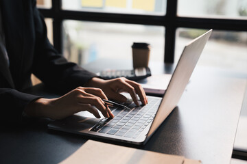 Workspace with notebook computer, blank screen and office equipment on wooden table