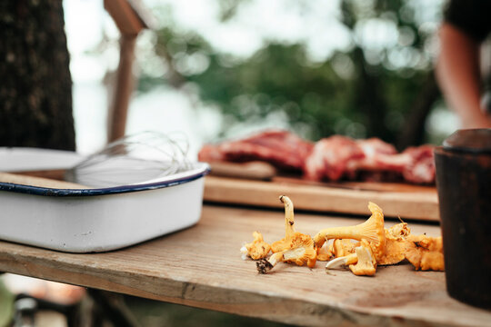 Close-up of chantarelles on table outdoors