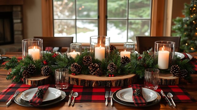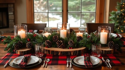 Elegant christmas table setting with candles festive garland and plaid table runner ready for a dinner.
