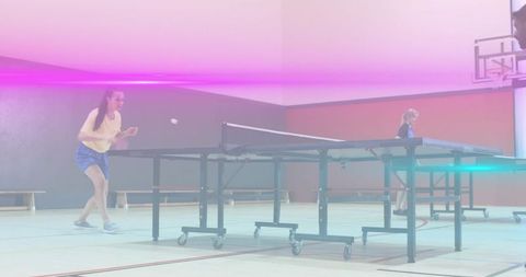 Adult women playing table tennis in gymnasium friendly rallying across ping-pong table