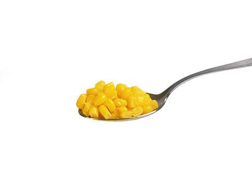 tablespoon with canned corn on white background