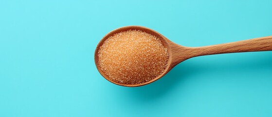 A wooden spoon full of granulated brown sugar is shown