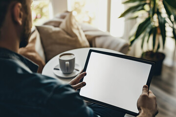 cropped view of man holding digital tablet with blank screen at home