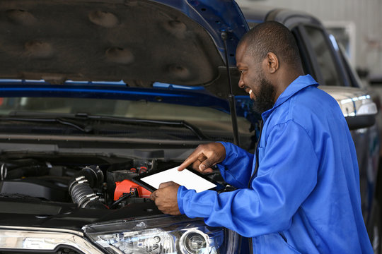 African-American mechanic with tablet computer working in car service center