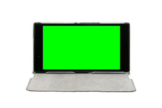 Digital tablet device with a blank screen displayed in a black smart case with stylus, isolated on white background