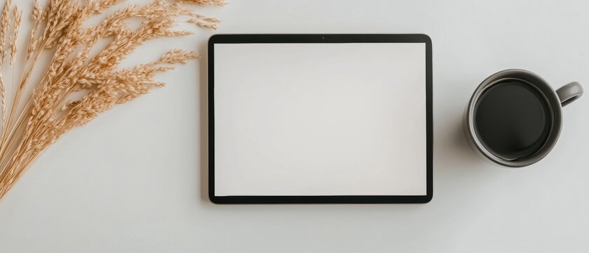 Flat lay of a black tablet with a blank white screen on a light grey background. on the left side of the image, there is a bunch of dried wheat stalks arranged in a fan-like pattern.