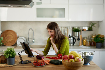 Woman following recipe cooking healthy food online with tablet at kitchen.