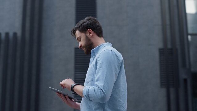 Banner of young middle eastern Israel businesswoman using tablet pc application for online remote work at office business building outdoors. Indian or arabic woman holding digital computer. Copy space