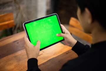 Mock up photo of a close up shot featuring a mans hand holding an iPad tablet with a green screen against the background of a wood cafe table