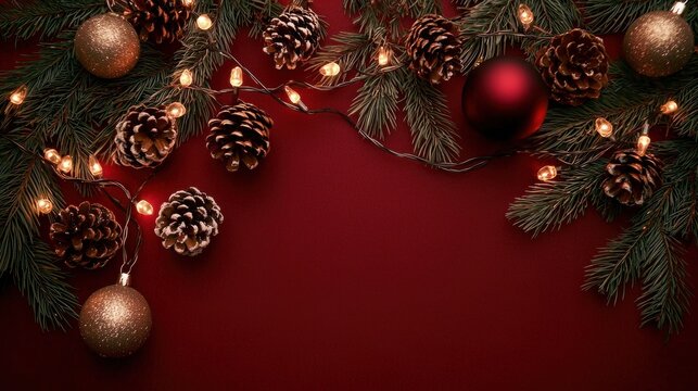 Rustic holiday flatlay framing wooden tabletop with pinecones, holly and sunlit shadows