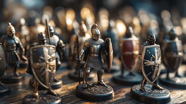 Close-Up of Medieval Knight Figurines with Shields and Armor on Wooden Surface