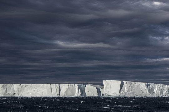 Tabular icebergs in Antarctica under a stormy sky