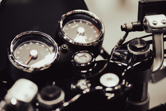Horizontal close-up of the speedometer and tachometer of a vintage black-toned motorcycle