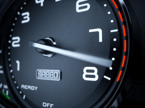 Close up of car speedometer with the needle pointing at 8 krpm