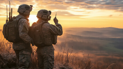 Silhouette of soldier are using drone and laptop computer for scouting during military operation : Generative AI