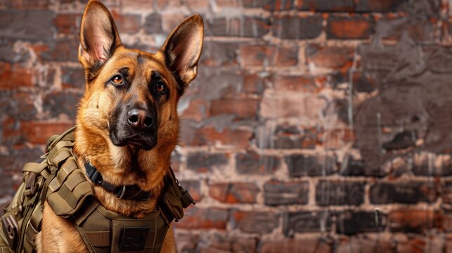 German shepherd in tactical gear against a brick wall. Security and law enforcement themes.