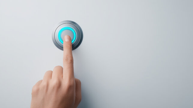 Hand is pressing glowing button on smooth surface, suggesting interaction from distance