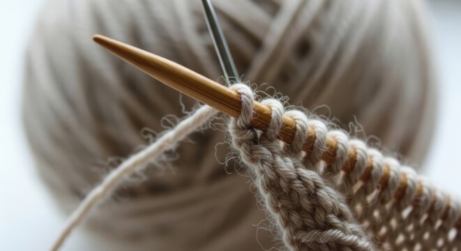 Close-up of knitting needles and yarn in warm tones