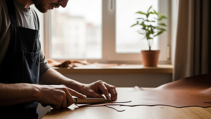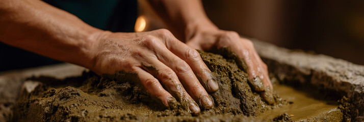 An artisan's hands skillfully shape clay on a workbench, showcasing craftsmanship and dedication, embodying the tactile experience of creating art with passion.