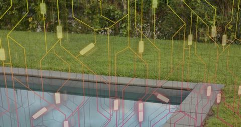 Backyard pool edge reflecting pale blue tiles with neon circuit overlay and glowing tags