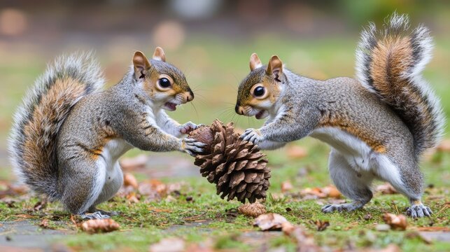 Cute squirrel holding a pine cone, sitting on a snowy log with falling snowflakes and blurred warm lights in the background. Concept of winter wildlife and cozy outdoor scenes.