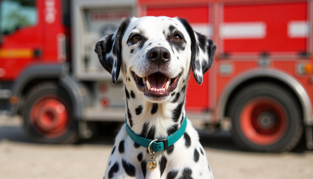Happy Dalmatian dog smiling in front of a fire truck, joyfulness