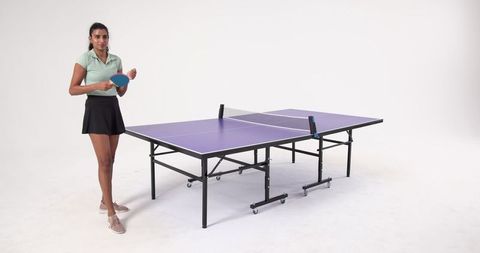Woman holding table tennis paddle in modern studio environment