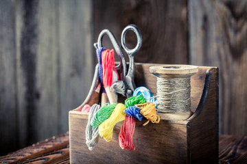 Needle, threads and scissors in tailor wooden box