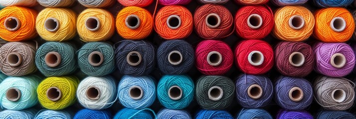 Assorted vibrant cotton threads on fabric background, close up shot in tailor s workshop