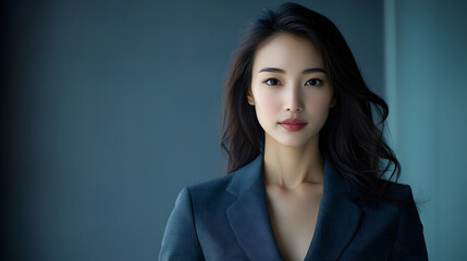Standing professional woman wearing navy suit and white shirt executive portrait