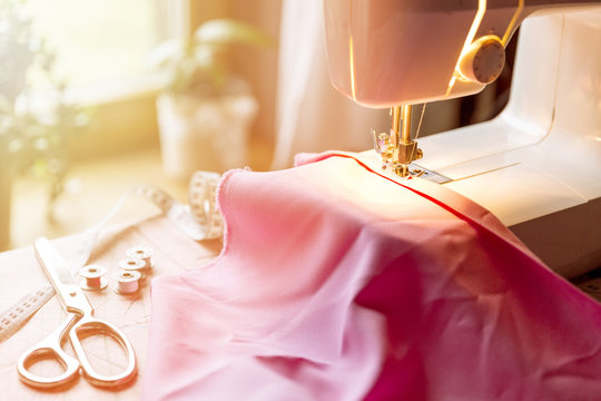 Sewing machine on table in workshop. Sewing process with scissors, measuring tape and spool