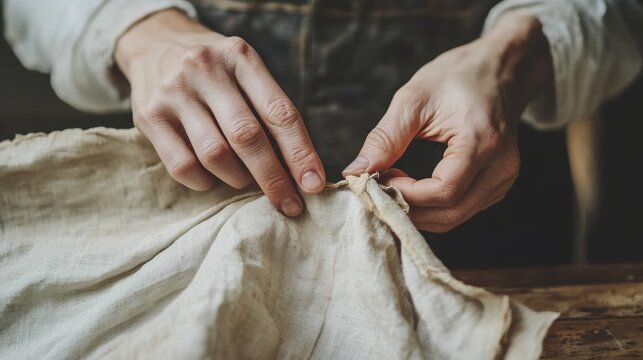 Close-up of hands in linen fabric stitching process