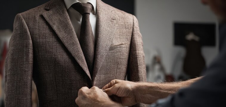Tailor measuring suit jacket on mannequin in bright studio