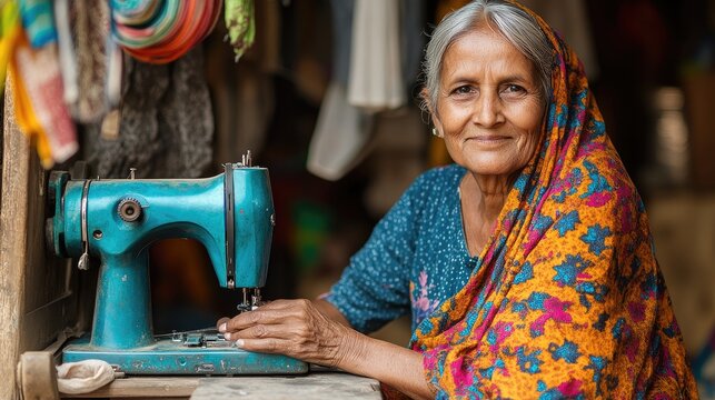 A cheerful seamstress sits at her sewing machine, smiling contentedly as she works, surrounded by fabrics and tools in her cozy, home-based workshop.