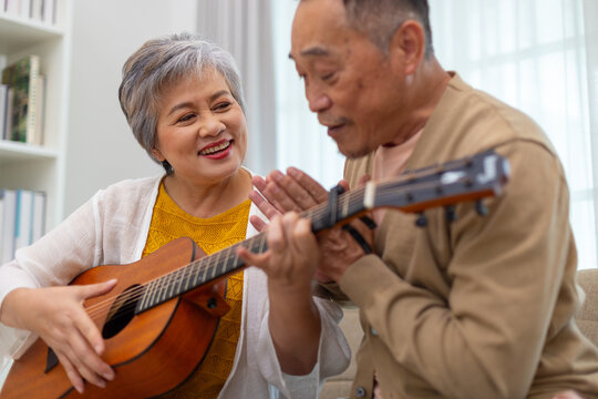 Happy asian senior elderly couple take it easy on retirement holidays playing guitar having fun in living room at home, Happiness singing together. Taking care of each other health in old age.