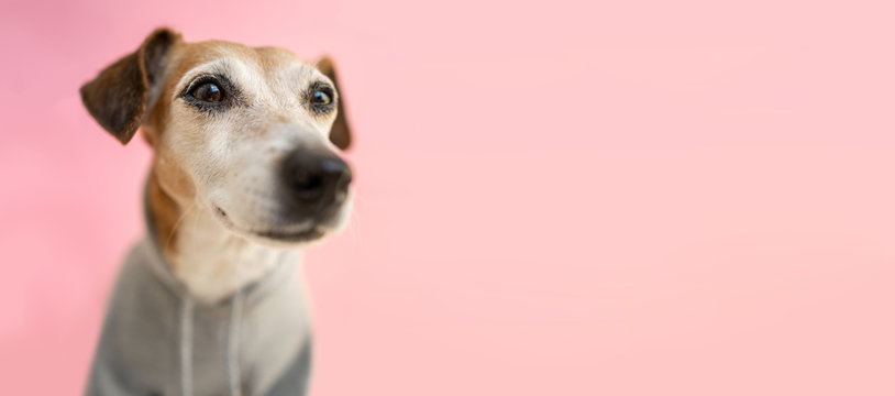 a serious face of dog in sweater hoodie face portrait. Gray pet clothes. Pink background. casual relaxed street style. Animal theme. Happy pet concept. Take it easy. long horizontal format banner