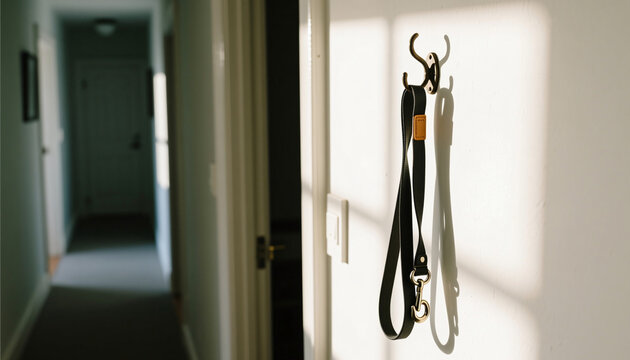 Dog leashes hanging on a hook in a hallway with natural light