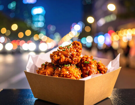 Crispy Korean fried chicken in takeout box with spicy glaze, sesame seed, chive, city street night, urban lights, delicious street food