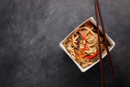 Close-up of noodles in a box with vegetables and beef in teriyaki sauce. Top view of Asian food, and wooden sticks. The concept of fast food. Copy space