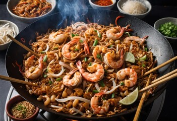 Box of wok noodles with vegetables, meat and chopsticks on red background. Space for text