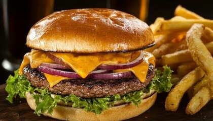 Delicious burger, french fries with ketchup on wooden board. Lunch meal. Fast food. Sesame bun, beef, cheese, tomatoes and lettuce. Fried potatoes chips. Restaurant menu, cafe, takeout food.