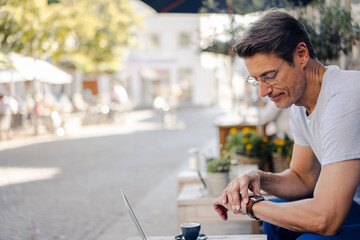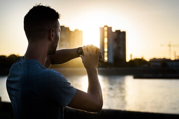 Young handsome sporty jogger taking break from exercising outdoors looking on a smart fitness watch